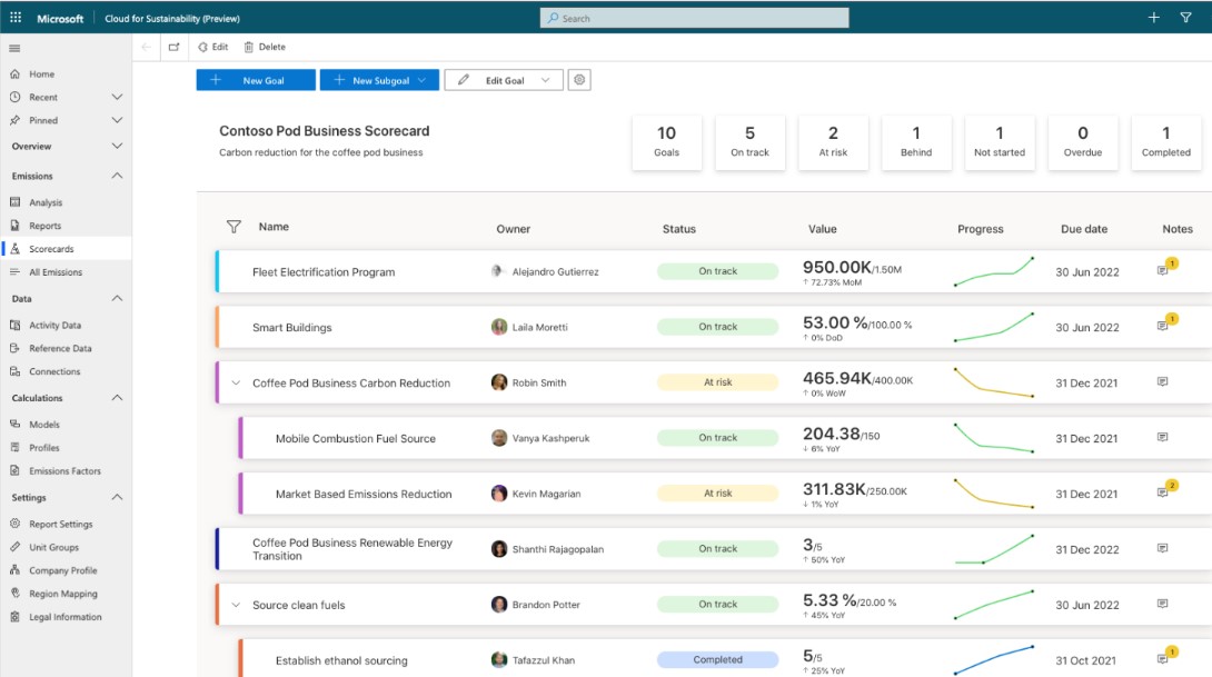 · Registrar las emisiones de carbono. A través de conexiones en tiempo real a las fuentes de emisiones, esta solución permite eliminar las cargas manuales de datos. Se pueden configurar las conexiones de datos desde un catálogo de conectores prediseñados y proveedores de datos operativos, como, por ejemplo, soluciones empresariales, proveedores de energía, herramientas de viaje, socios comerciales, IoT y telemetría de sistemas, entre otros. Además, utiliza un modelo de datos común, que permite comparar el progreso con los de otras que también usan Microsoft Cloud for Sustainability, acelerar la integración de datos y facilitar la generación de informes.
